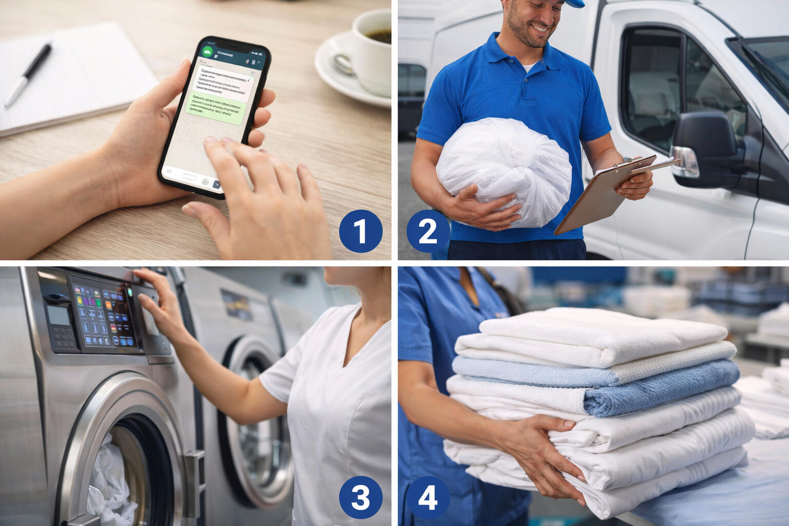 1. Envie mensagem ou pedido de orçamento2. Agendamos recolha ou entrega3. Tratamento profissional da roupa4. Entrega organizada e pontual